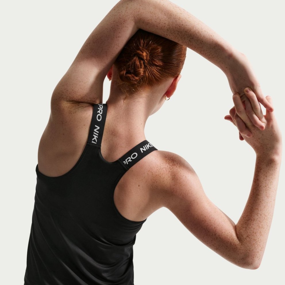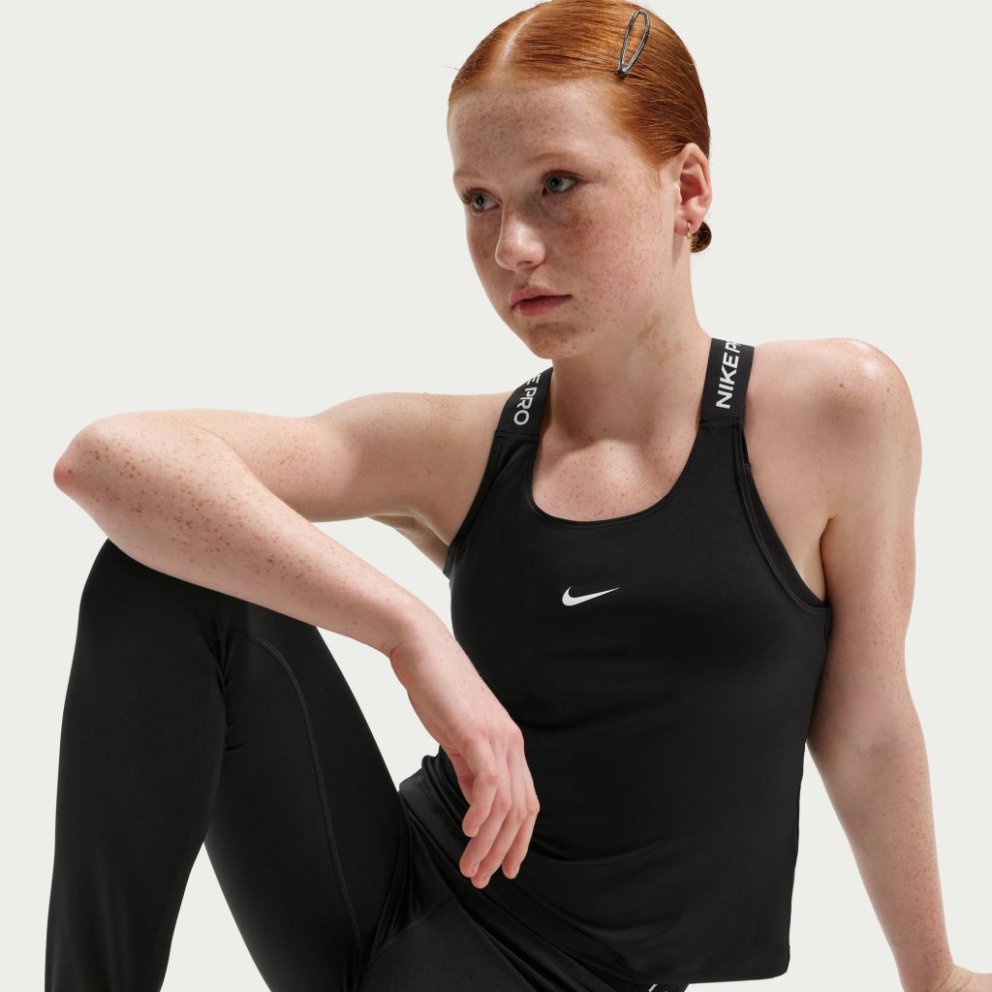 Vönduð litasamsetning og andstæðar Pro-merktar ólar gefa þessum vinnuhesti í toppformi lúxuslegt yfirbragð. Toppurinn er byggður á nauðsynlegum eiginleikum eins og þægilegri teygju og svitadrífandi Nike Dri-FIT tækni sem hjálpar þér að halda þurru og þægilegu á æfingu. Ómissandi flík fy