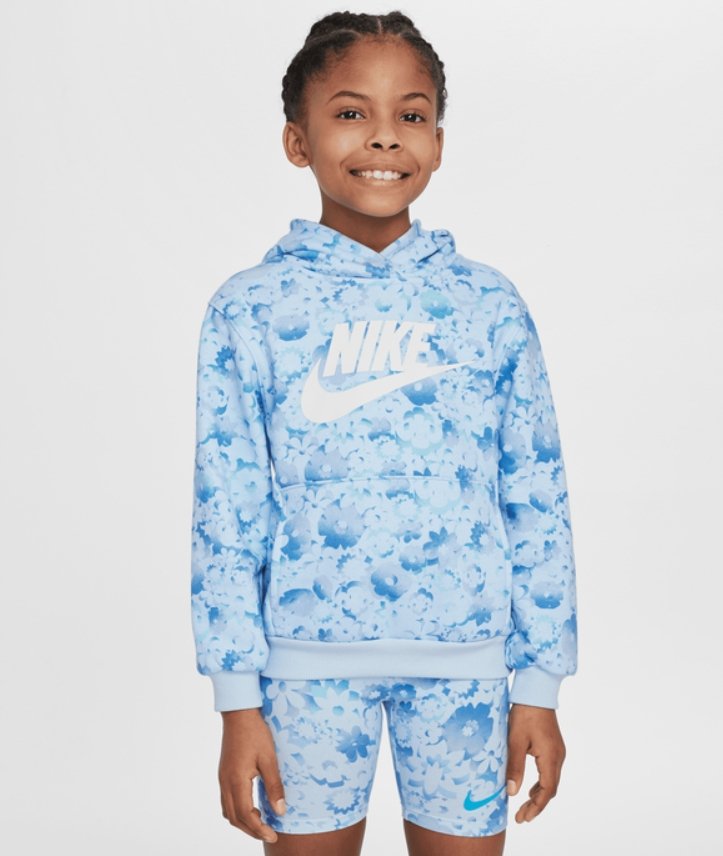 Your child will be fresh in this hoodie, made of blended cotton fleece with a smooth outside and soft inside in a roomy cut that feels nice and cozy. Finish with a handy kangaroo pocket and your kiddo gets a timeless pullover comfy enough for all-day wear. Pair with any of the Nike Flow-Ral bottoms for a coordinated look that complements their kicks. Product Details:
