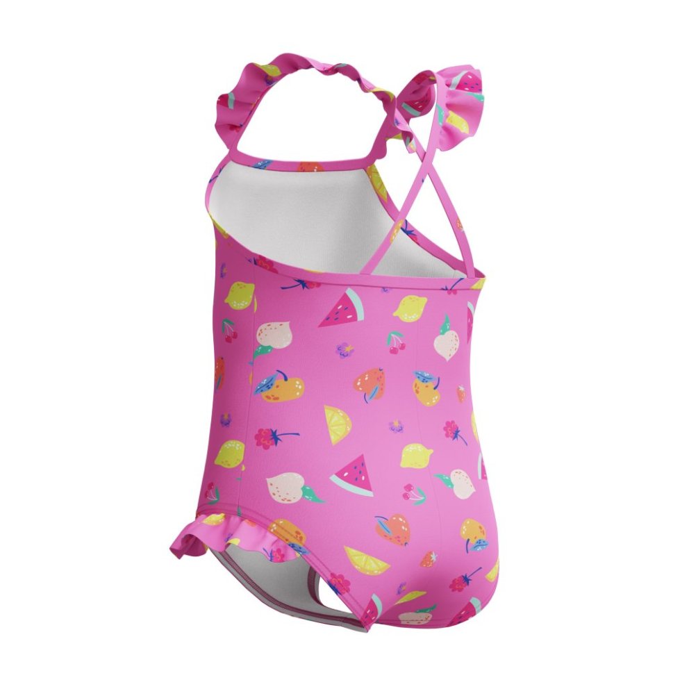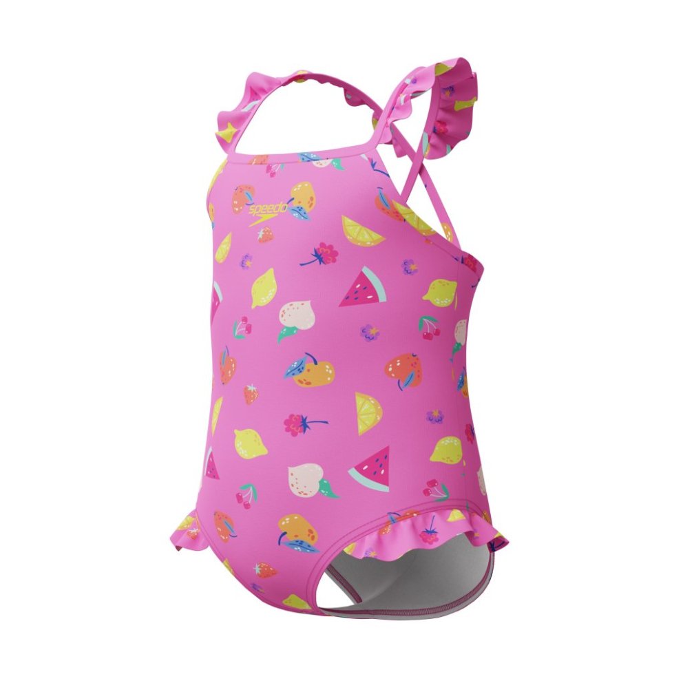 Speedo Infant Frill Thinstrap sundbolurinn er hannaður fyrir skemmtilegar stundir í vatni. Hann veitir þægindi allan daginn og er fullkominn fyrir litla sundgarpa sem elska leik og busl. Bolurinn er úr EnduraFlex efni með 4-átta teygju og CREORA® HighClo™, sem tryggir gott snið og langvarandi endingu. Þægindi og hreyfifrelsi Mjóar hlýrar (Thinstrap) sem veita óhindraða hreyfingu í öxlum Skemmtilegur ruffla-kantur (frill trim) sem gefur fallegt og leikandi útlit Full þekja (Full Coverage) með mjög lágum skálmum fyrir aukna vernd Fóðraður að framan fyrir aukið öryggi Ending og efni ?? Klórþolinn – heldur gæðum sínum lengur ?? Flosþolinn (pilling resistant) ?? Heldur sniði sínu lengur með CREORA® HighClo™ ?? 4-átta teygja fyrir hámarks þægindi Efnisblanda: 80% nylon 20% elastan (CREORA® HighClo™) Speedo Infant Frill Thinstrap er þægilegur og endingargóður sundbolur með fallegu smáatriði – fullkominn fyrir gleðistundir í vatni.