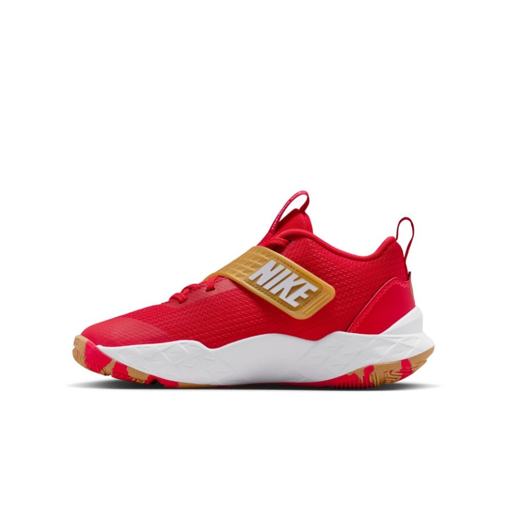 Nike Team Hustle D er hannaður fyrir börn sem elska körfubolta. Stillanlegt lokunarkerfi með reimum og frönskum rennilás (hook-and-loop) gerir auðvelt að festa skóna fljótt og örugglega. Mjúk froða undir fæti veitir góða dempun, á meðan slitsterkur gúmmíundirsóli tryggir grip og stöðugleika fyrir leik á útivöllum. Stórir togflipar á tungu og hæl auðvelda innstigið, og öndunargott mesh efni í efri hluta hjálpar til