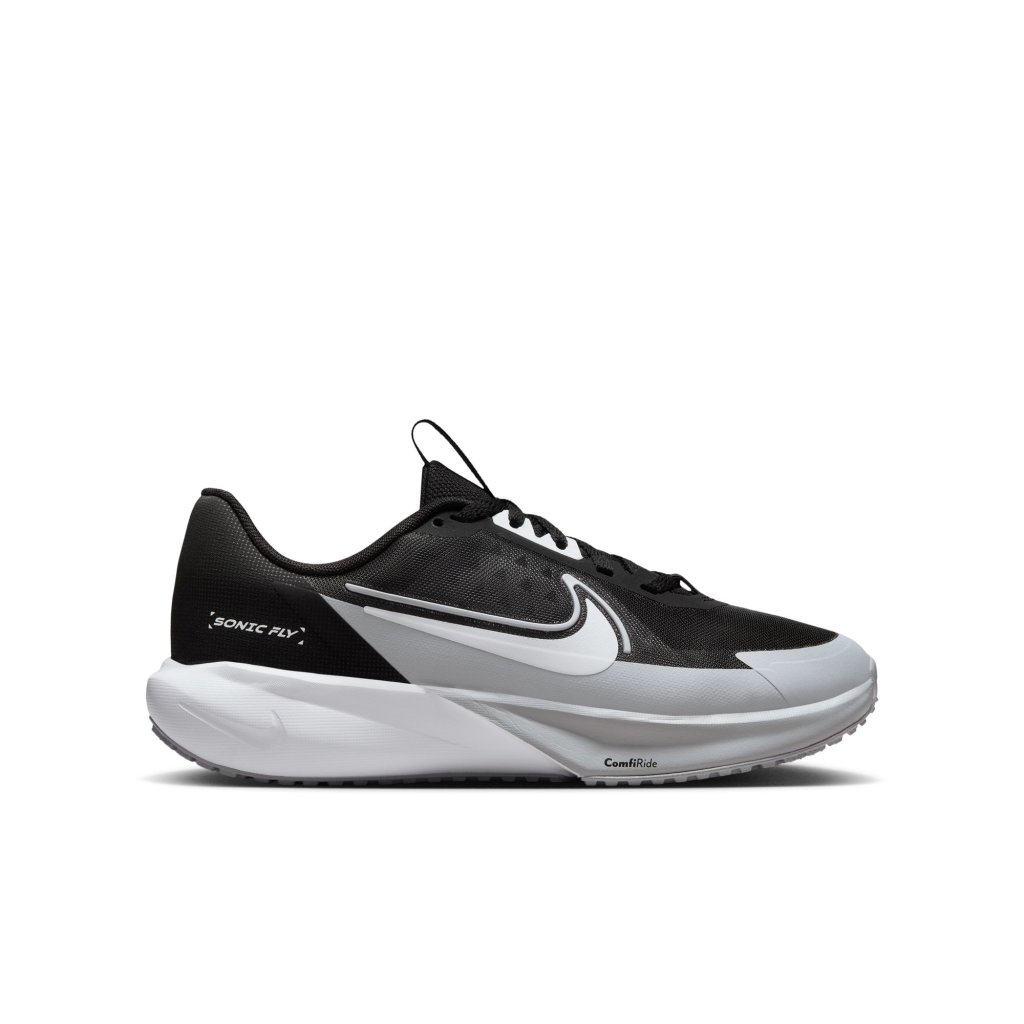 Why run when you can fly? Designed for record breakers in the making, the Nike Sonic Fly pairs a lightweight design with soft, springy foam that helps add energy to every stride. Responsive Cushioning We packed the midsole with soft and springy foam that absorbs impact and adds energy to every stride you take. Lightweight But Durable Less weight means more speed. Mesh throughout the upper helps keep these shoes lightweight and breathable. We reinforced the toe and sides for added durability. Support You Can Feel Bands at the side of your feet work with the laces to add stability and a secure feel. Traction That Keeps Up Rubber outsole with Waffle-inspired tread pattern helps provide durable traction. Product Details: