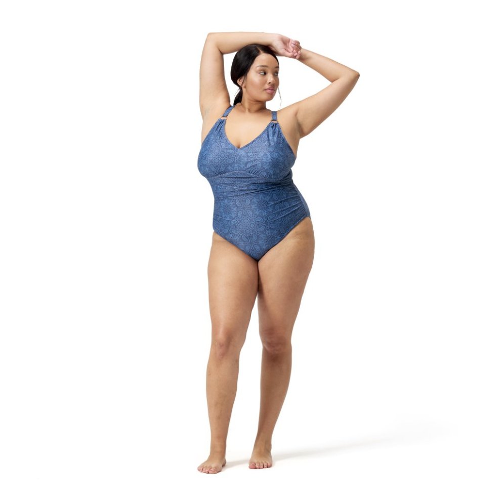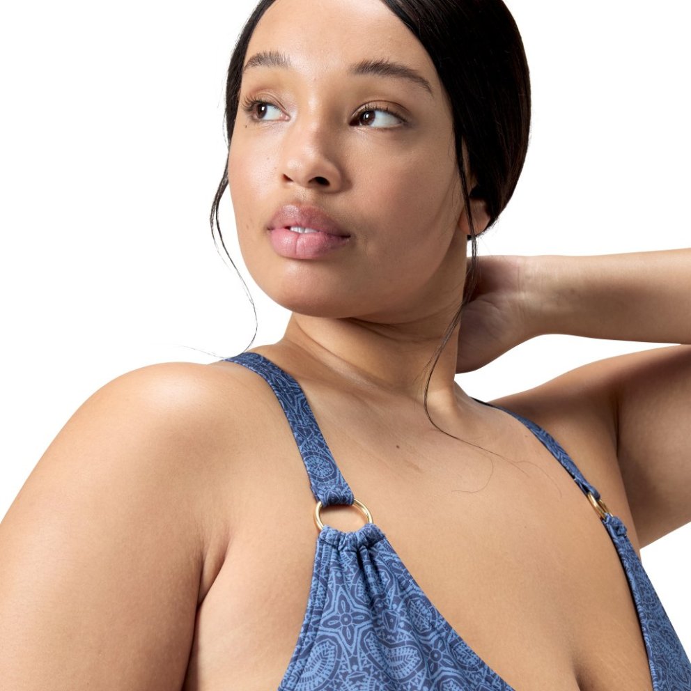 Love your holiday look wearing our new blue Shaping Swimsuit, available in extended sizes with a pretty V neckline, figure-flattering ruching and a sophisticated mosaic print. Embossed gold branding upgrades your beach style, while removable bra pads offer support, and the adjustable cross-back straps ensure a great fit. Cut from our premium, comfortable body-shaping fabric, which works to smooth and contour the body, it's ideal for the beach or pool. Offering higher chlorine resistance than standard swimwear fabrics, the fabric fits like new for longer with CREORA® HighClo™. Also, the Nylon yarn in the fabric is made from 100% pre-consumer waste, such as waste fabric from factories.