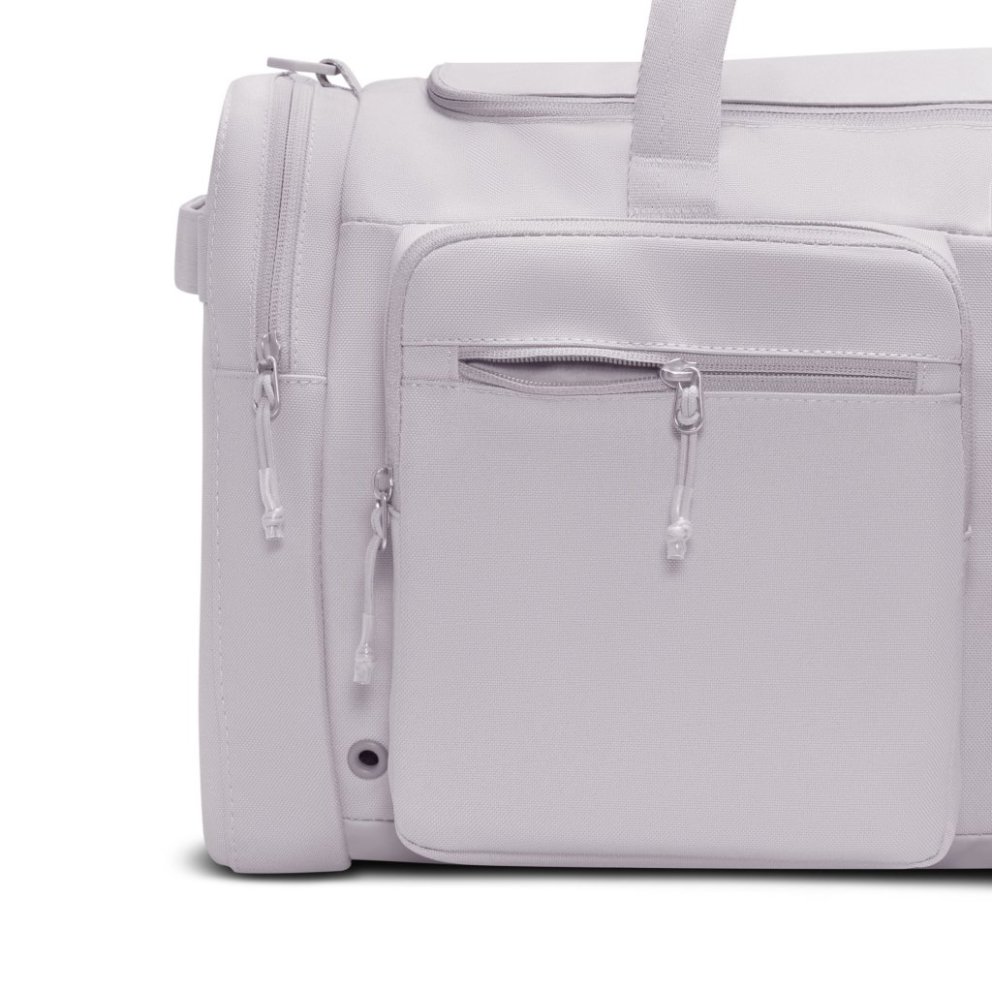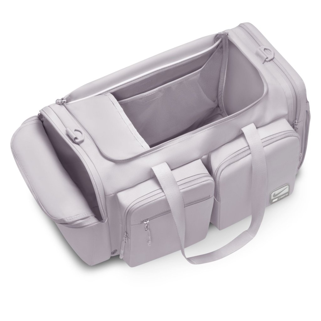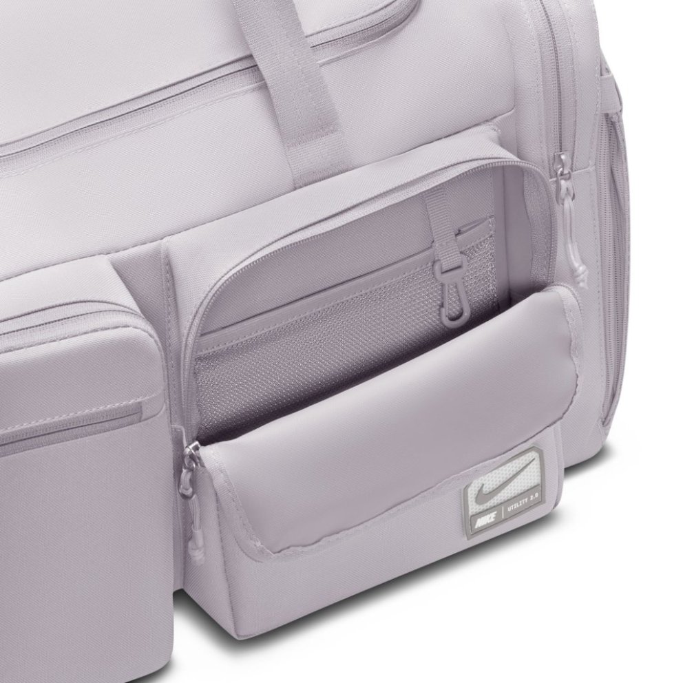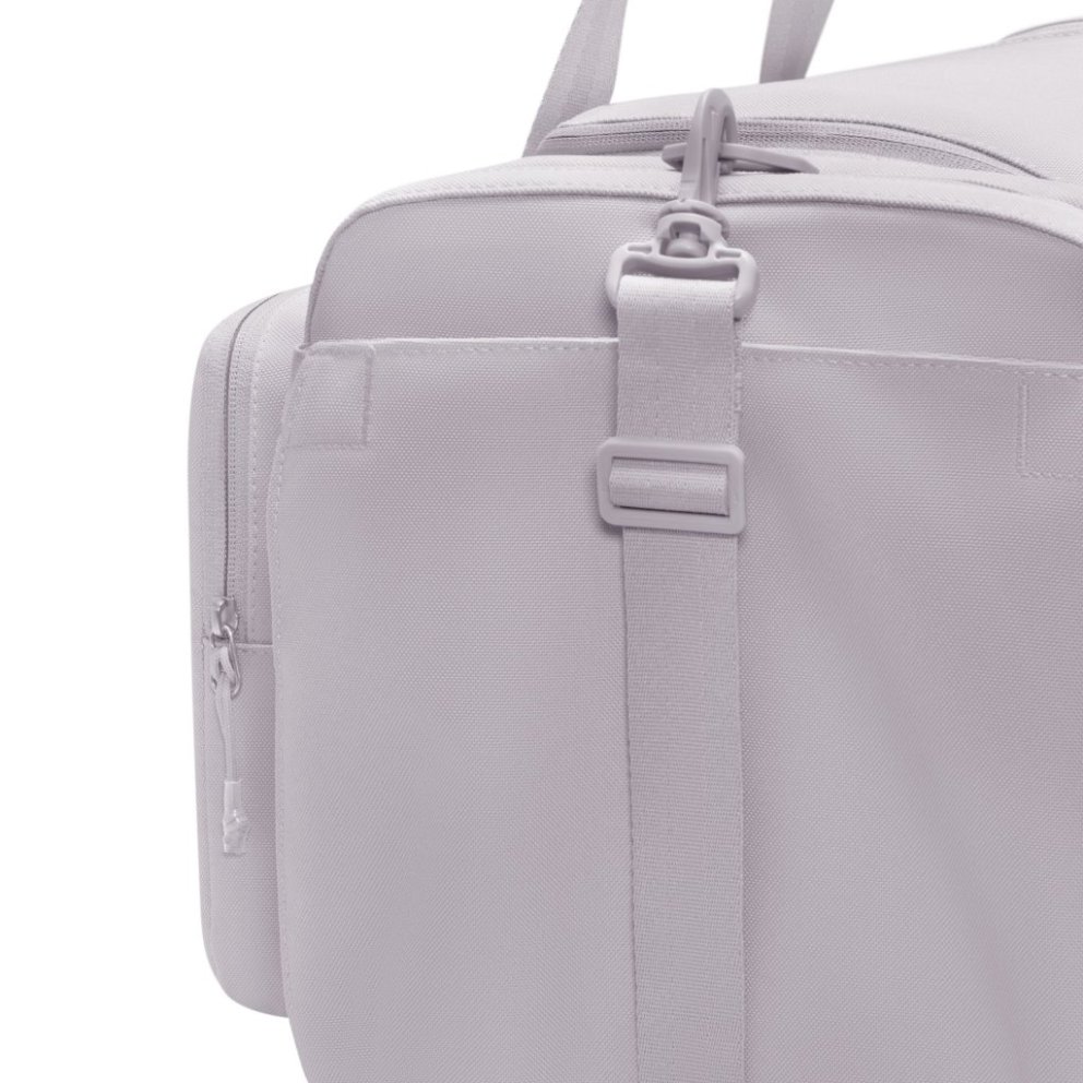 Utility Duffel taskan hjálpar þér að komast beint í æfinguna með fjölmörgum vösum sem halda dótinu þínu skipulögðu. Aðalhólfið er rúmgott og rúmar bæði fataskipti og strigaskó, á meðan ytri rennilásvasar veita fljótlegt aðgengi að smærri nauðsynjum. Stillanleg axlaról ásamt burðarhöldum að ofan og á hlið gefa þér þægilega og fjölbreytta burðarmöguleika. Þétt ofið pólýester veitir sterkan og endingargóðan stuðning, og innbyggð loftræsting hjálpar búnaðinum þínum að anda eftir æfingu. Upplýsingar um vöru: *Mál: u.þ.b. 56 cm (L) × 28 cm (B) × 30 cm (