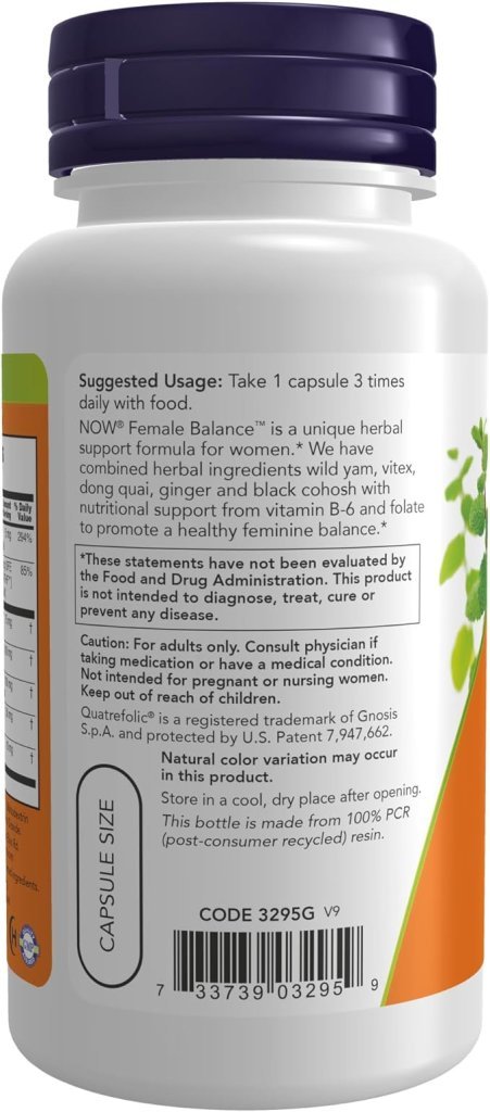 • Female Balance Inniheldur jurtir eins og villi yam rót, kínverska hvönn, munkapipar, engifer og slöngujurt ásamt næringarstuðningi frá B-6 vítamíni og fólati til að stuðla að heilbrigðu hormónajafnvægi kvenna.
