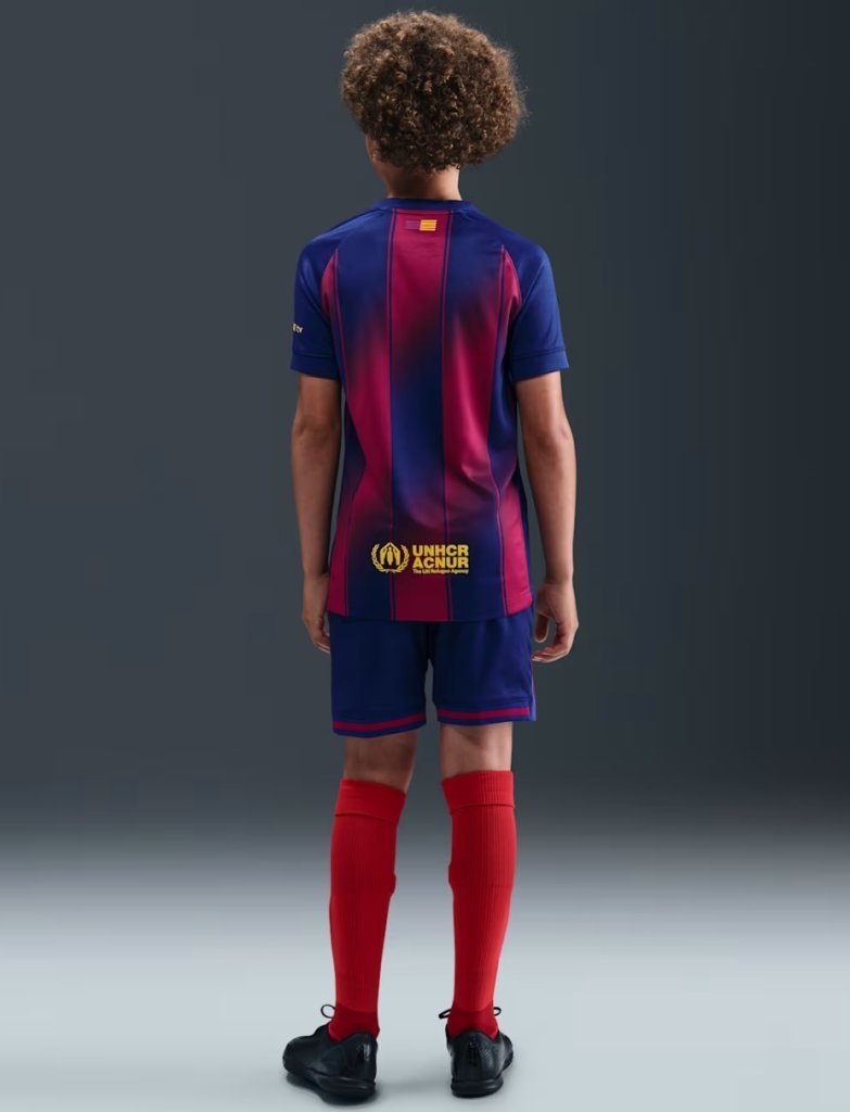 FC Barcelona's 2025/26 home jersey updates one of the most recognizable looks in soccer. Their iconic Blaugrana is fused with movement-inspired graphics and bright, energetic accents to celebrate their fans' unity and devotion to the club. Inspired by the Pros Our Stadium collection pairs replica design details with sweat-wicking technology to give you a game-ready look inspired by your favorite team. Stay Dry Nike Dri-FIT technology moves sweat away from your skin for quicker evaporation, helping you stay dry and comfortable. Product Details: