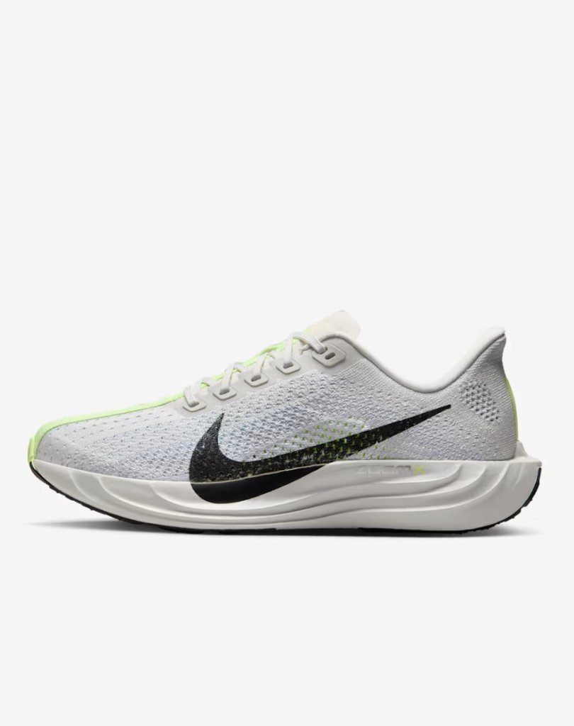 Ultra-responsive, light foam offers next-level energy return. Take responsive cushioning to the next level with the Pegasus Plus. It energises your ride with full-length, super-light ZoomX foam to give you a high level of energy return for everyday runs. And a stretchy Flyknit upper contours to your foot for a seamless fit. Flyknit Upper The Flyknit upper has perforations to help reduce the weight of the shoe and make it more breathable. ZoomX midsole The ultra-responsive ZoomX foam midsole delivers Nike's highest energy return. Reliable traction High-abrasion rubber on the outsole provides traction. Product details: