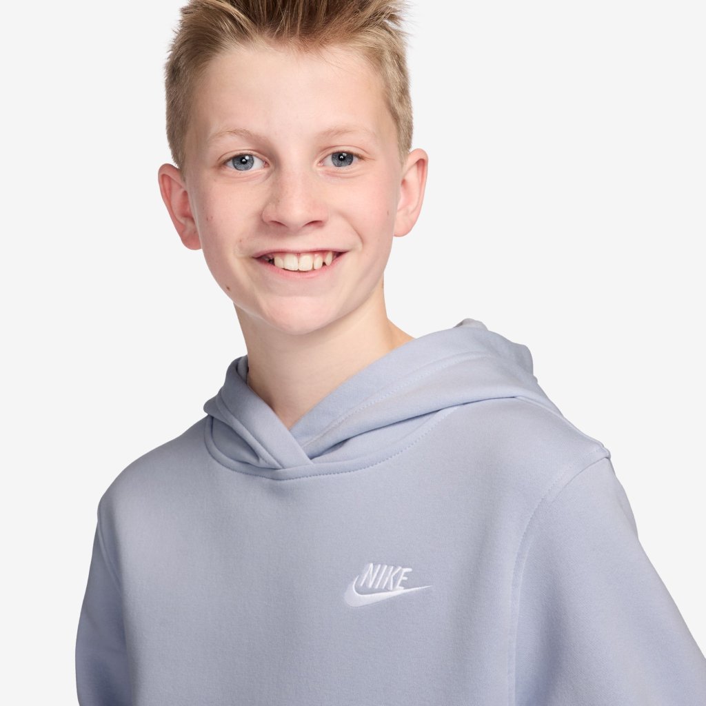 Hvað elskum við við Club Fleece? Það er slétt að utan, mjúkburstað að innan og létt flísefnið er fullkomið sem aukalag þegar þú þarft smá auka hlýju. Nánast töfrandi hefur þessi hettupeysa verið þekkt fyrir að hita upp kaldar frímínútur, taka kuldann úr vetrarboltaleikjum og setja bros á andlit allra sem klæðast henni. Uppfært stærðarkerfi leggur áherslu á snið frekar en kyn, svo hvert barn geti leikið á sinn hátt. Stór vasi að framan býður upp á pláss fyrir snarl og fjársjóði dagsins, á meðan op að framan á hettunni veitir nægt rými til að auðvelda að fara í og úr peysunni. Upplýsingar um vöru: