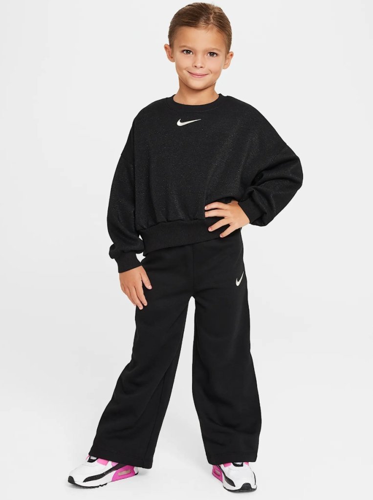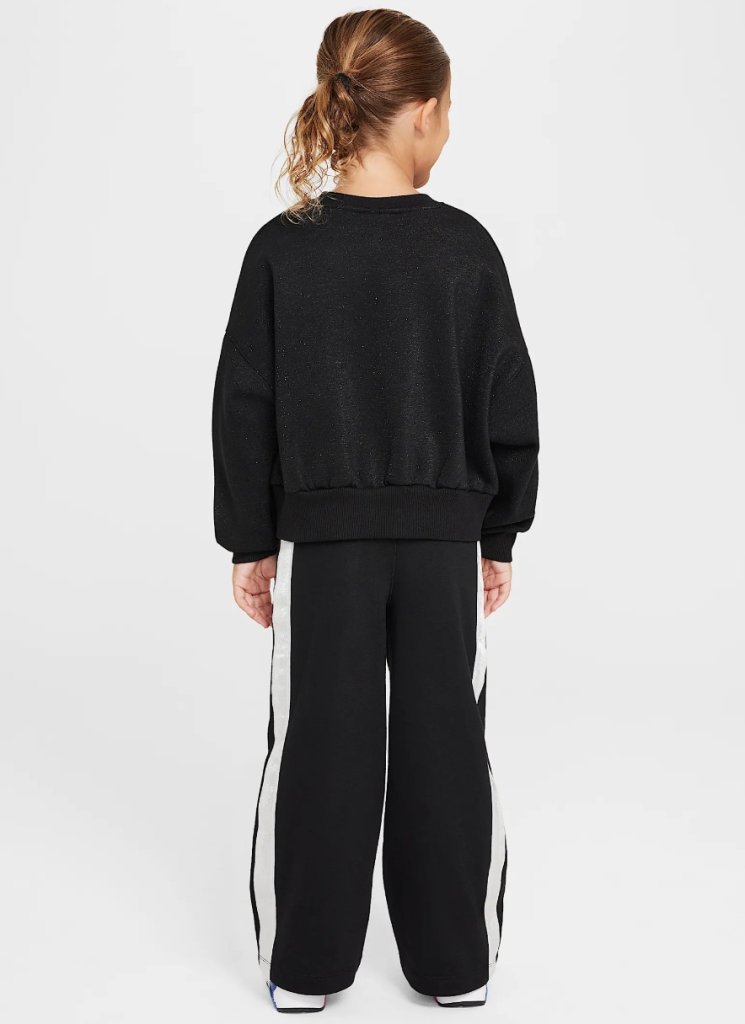 Enhance your child's shine while easily getting them dressed with this 2-piece fleece set. The crew top contains lurex fibers for an allover shimmer with dropped shoulders for a relaxed fit. The pants have a stretch waistband for a comfy fit and straight legs for a cozy feel and a classic look that will complement their Nikes. Benefits Both pieces can be worn separately with other pieces in your child's wardrobe. Product Details: