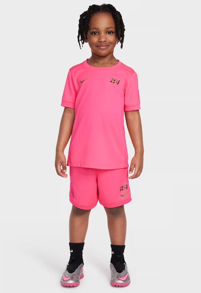 Kids can bring the heat while repping their favorite soccer player, Kylian Mbappé, in this 2-piece set. Both pieces are made of recycled poly knit fabric enhanced with quick-drying, moisture-wicking, Dri-FIT technology to help littles stay cool and dry while they speed down the pitch or around the playground. The top has a tagless crewneck for easy wear with a mesh back and sides for extra cooling. The shorts have a stretch waistband as well as mesh insets for extra breathability and comfort. Benefits: