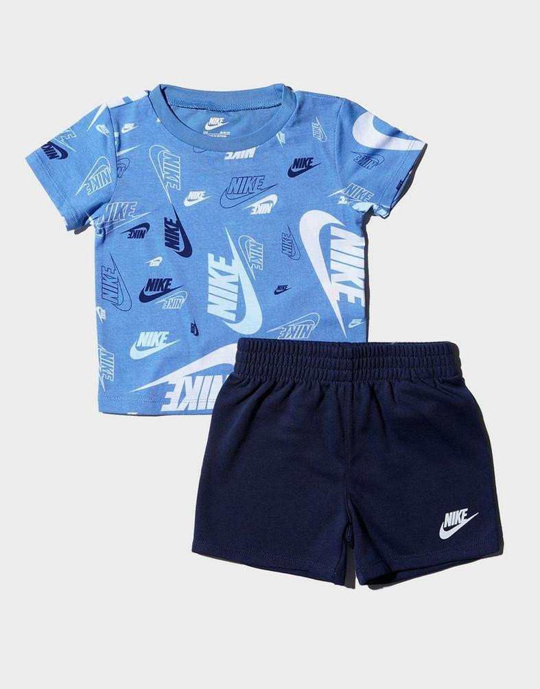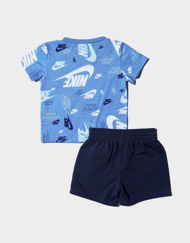 Cop a fresh summer look with this children's Sportswear All-Over Print T-Shirt/Shorts Set from Nike. In a Blue colourway, this set features a soft cotton tee and shorts for lasting comfort. The shorts have an elasticated waistband for a relaxed wear and are finished up with classic Nike branding. Material & Care: