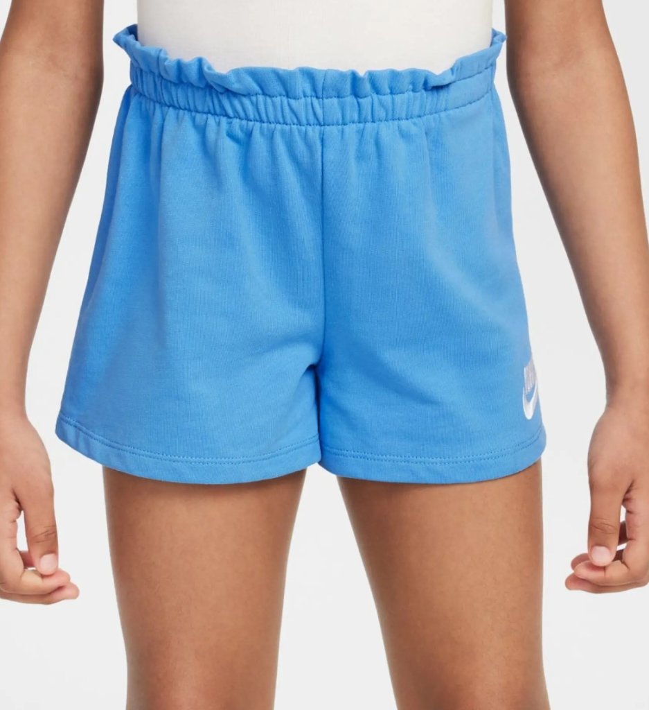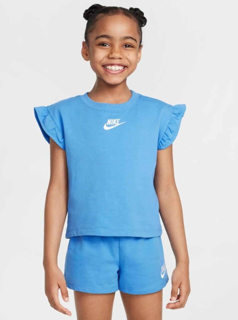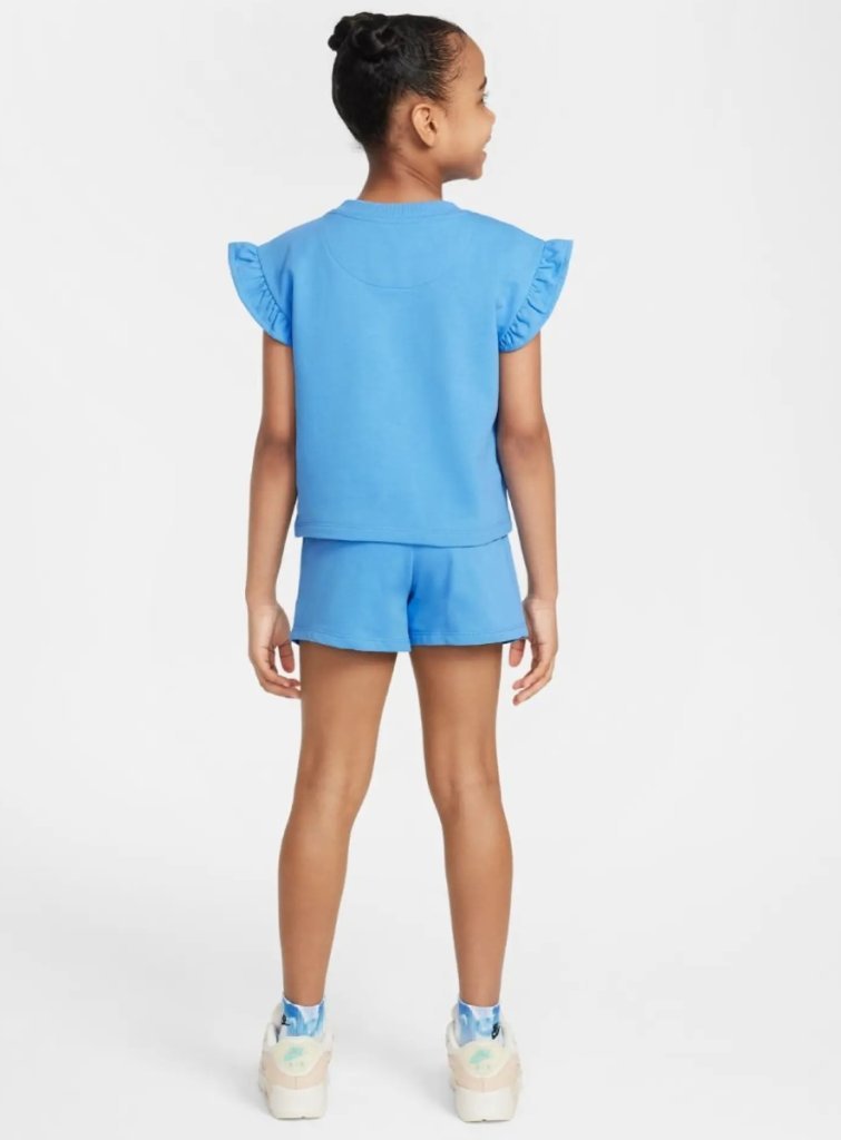 Cute Nike shorts set consisting of a top and a pair of sweat shorts in dusty blue with embroidered white brand and logo prints. The Sweat shorts have a wide elastic edge at the waist with a ruffled finish, and the top's winged edge forms a little sleeve.