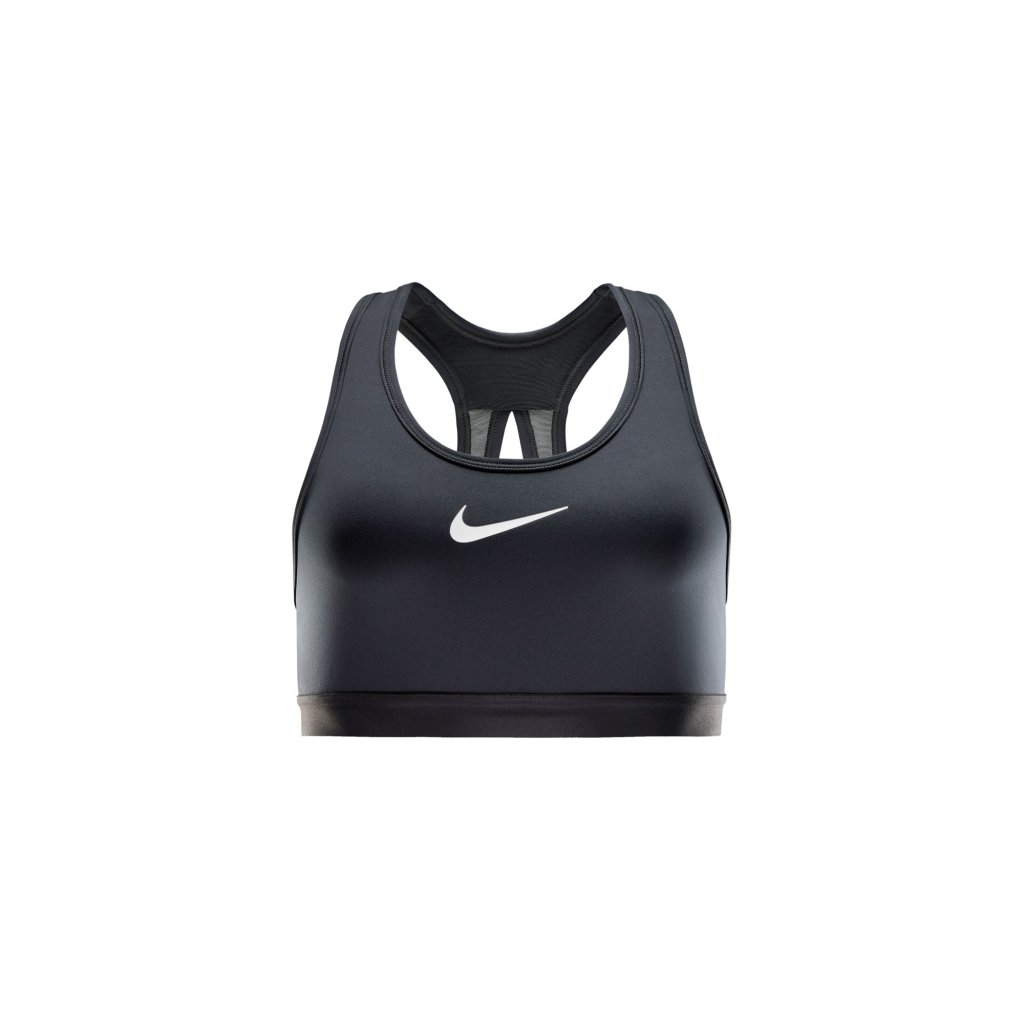 Get ready to go all out in this Swoosh sports bra. High support gives you a locked-in feeling and helps keep motion to a minimum, making it ideal for runs and high-impact sport. The sweat-wicking, adaptive material quickly recovers its shape so you can stay comfortable throughout your workout. And when you need to make adjustments, the bottom band's extended hook-and-loop closure makes it easy to change up your fit. Adaptive fit and fabric When you're going hard, the bra's lightweight, adaptive fabric feels like a second skin for superior comfort and support that doesn't budge. When it's time to rest, it recovers quickly and provides a compressive feel without too much squeeze. Super-stretchy fibres make for an easy on/off experience so that you don't have to bend over backwards to get out of your bra. Enhanced Dry Nike Dri-FIT technology moves sweat away from your skin for quicker evaporation, helping you stay dry and comfortable. It is combined with plenty of mesh—in the front lining and on the back—so that excess moisture is the last thing on your mind. A Swoosh for Everybody The Swoosh sports bra has long been a partner to your workouts and beyond but not everyone has the same needs. Looking for minimal coverage? The Swoosh Light Support is the bra for you. Like the modesty and structured feel of sewn-in pads? Try the Swoosh Medium Support. Product details: