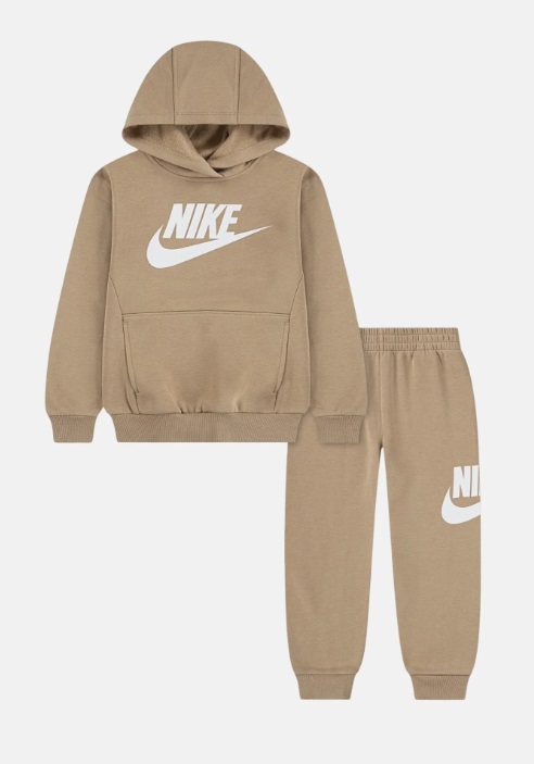 The Nike hoodie has a fixed hood and it has long sleeves and wide ribbed edges. The sweatpants have long legs with wide ribbed edges, and there is a wide elastic edge at the waist.