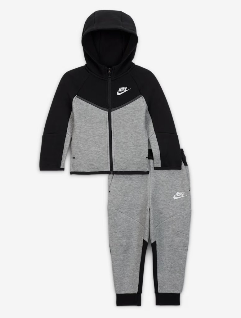 Made of bonded jersey knit fabric, this 2-piece set is inspired by the classic warmup suit. The hoodie has a full-zip closure that makes layering easy, and the matching tapered pants have ribbed cuffs and a stretch waistband for a comfy fit the smallest athletes can play freely in. Pair with any Nike tank or tee for a completed look that will complement their kicks. Benefits:
