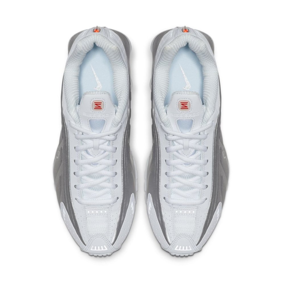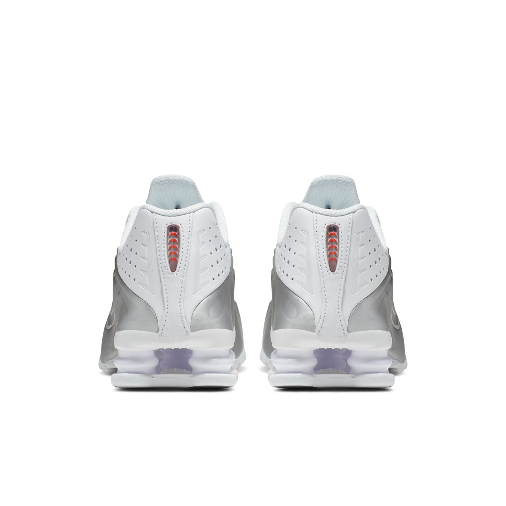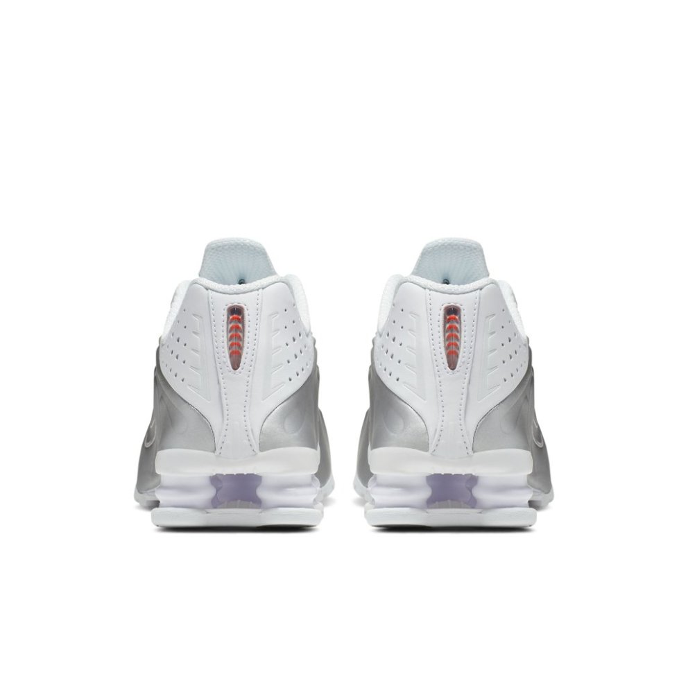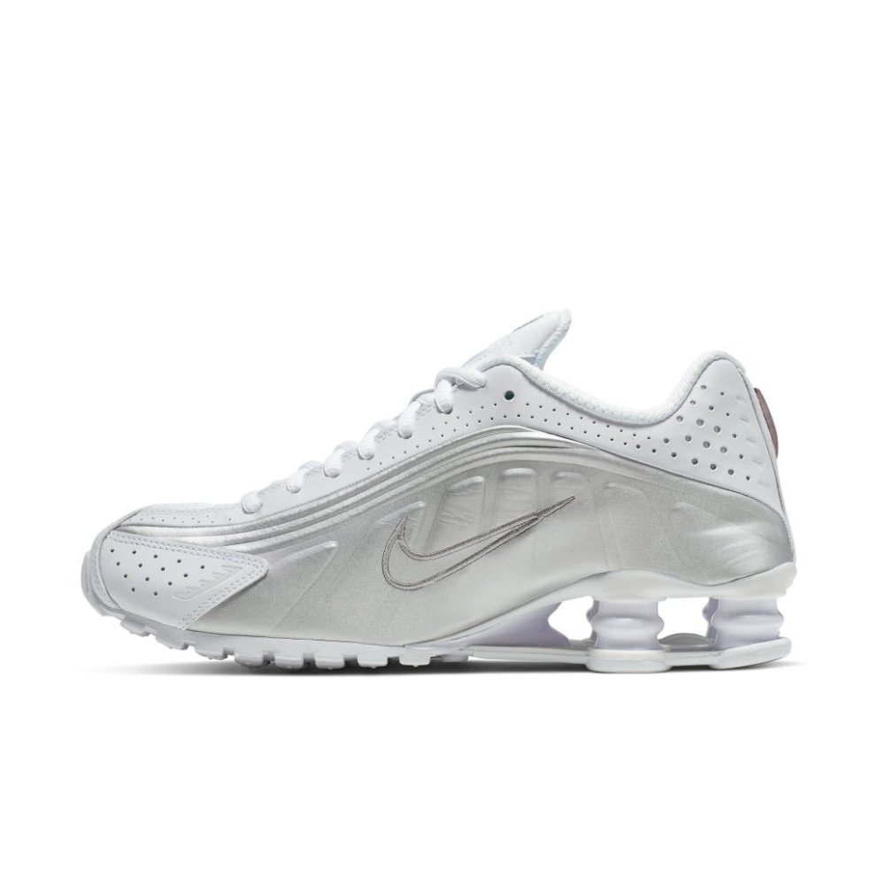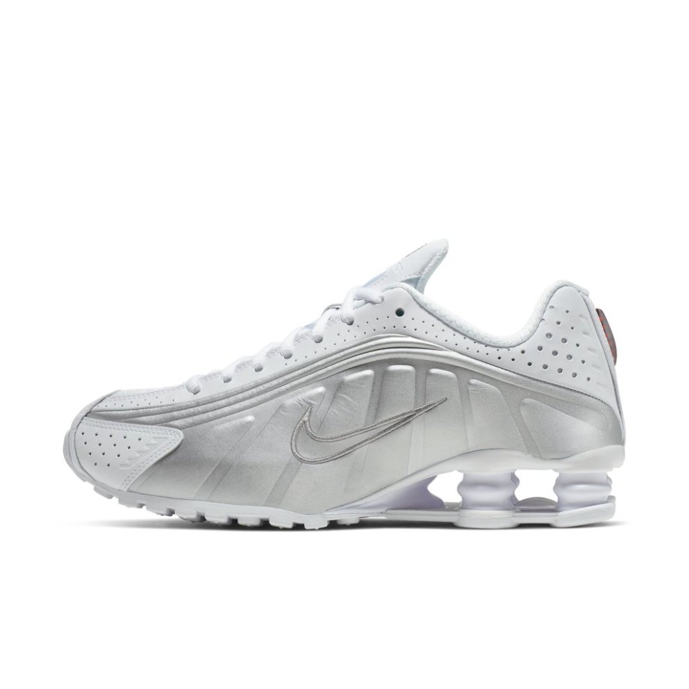Making its audacious debut in 2000, the Shox R4 shattered the mould of traditional sneakers with its futuristic look. It combines a silky-smooth synthetic upper with fluid ripples and laser perforations, which take style cues from spacesuits and other astronaut gear. 4 compressive columns lift the heel, while offering both a stable structure and bona-fide bounce. Cloaked in smooth white synthetic leather with hits of Metallic Silver and Max