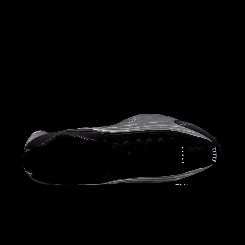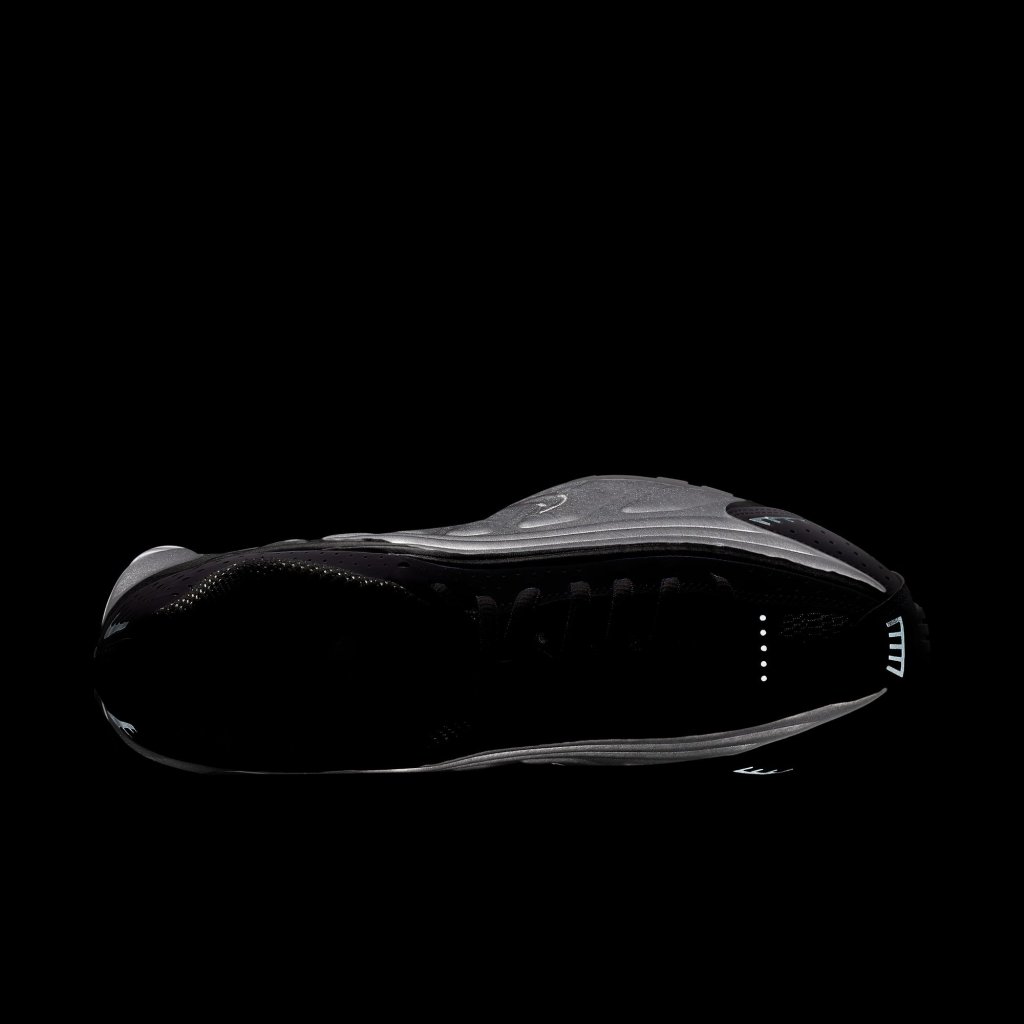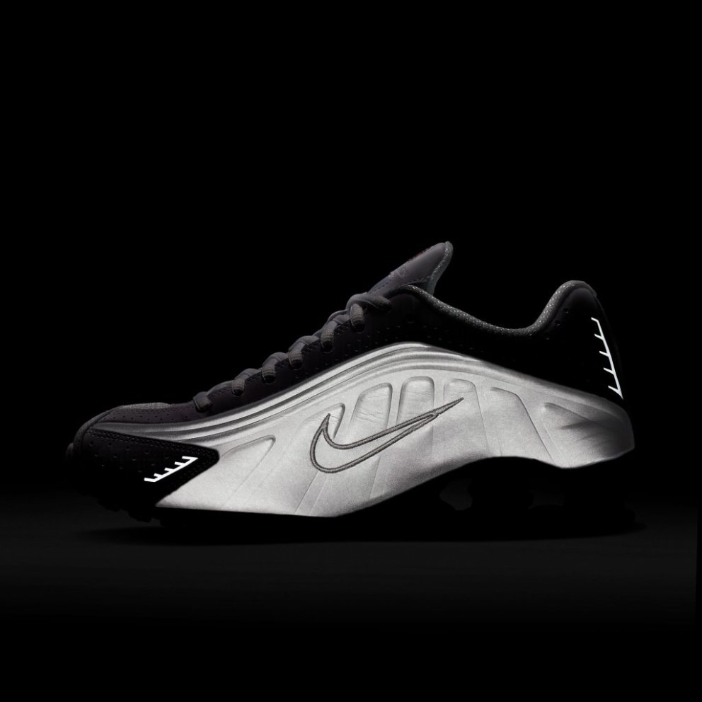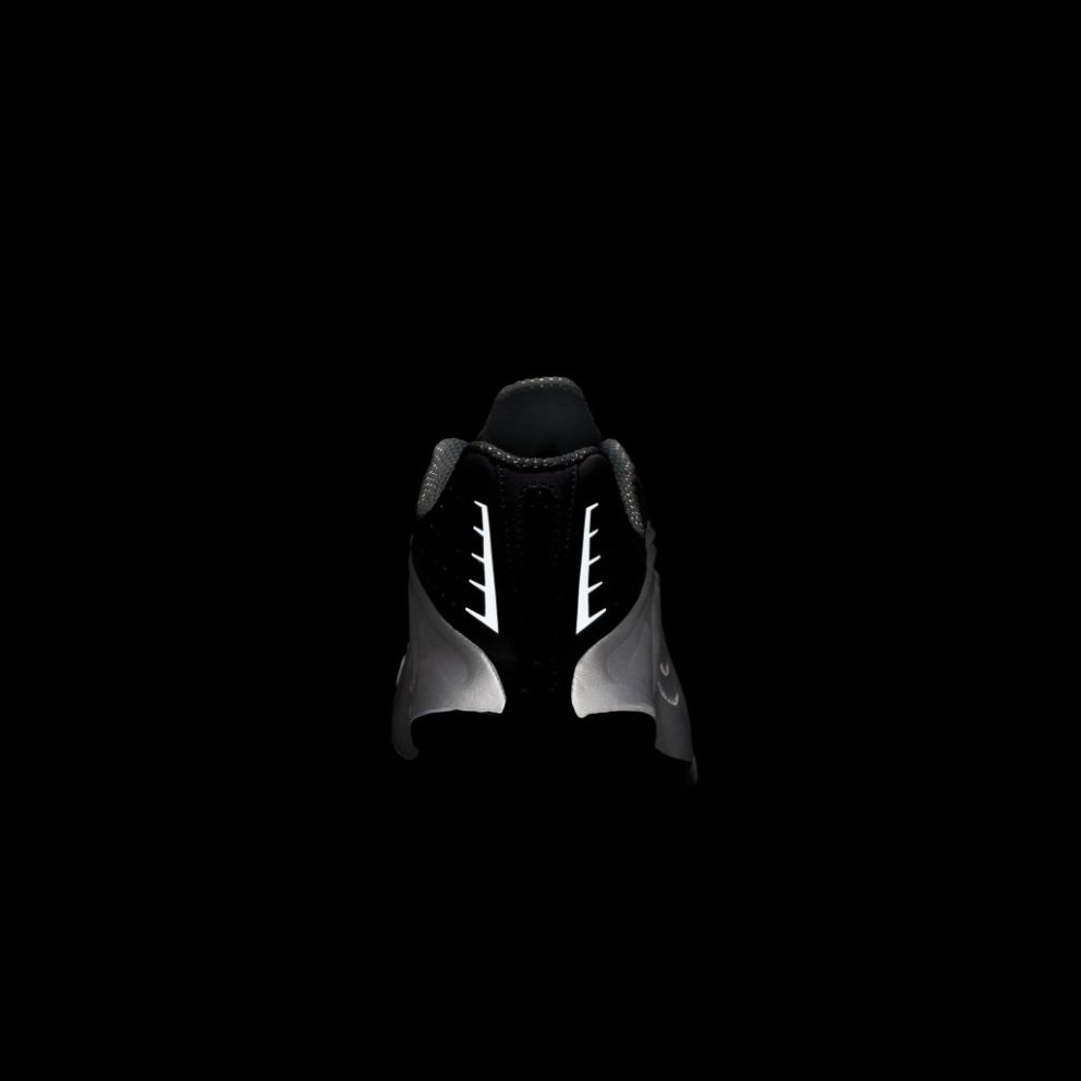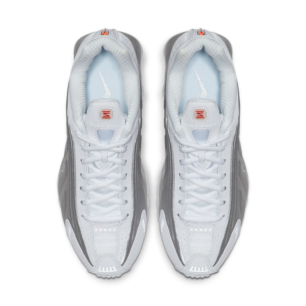 Making its audacious debut in 2000, the Shox R4 shattered the mould of traditional sneakers with its futuristic look. It combines a silky-smooth synthetic upper with fluid ripples and laser perforations, which take style cues from spacesuits and other astronaut gear. 4 compressive columns lift the heel, while offering both a stable structure and bona-fide bounce. Cloaked in smooth white synthetic leather with hits of Metallic Silver and Max