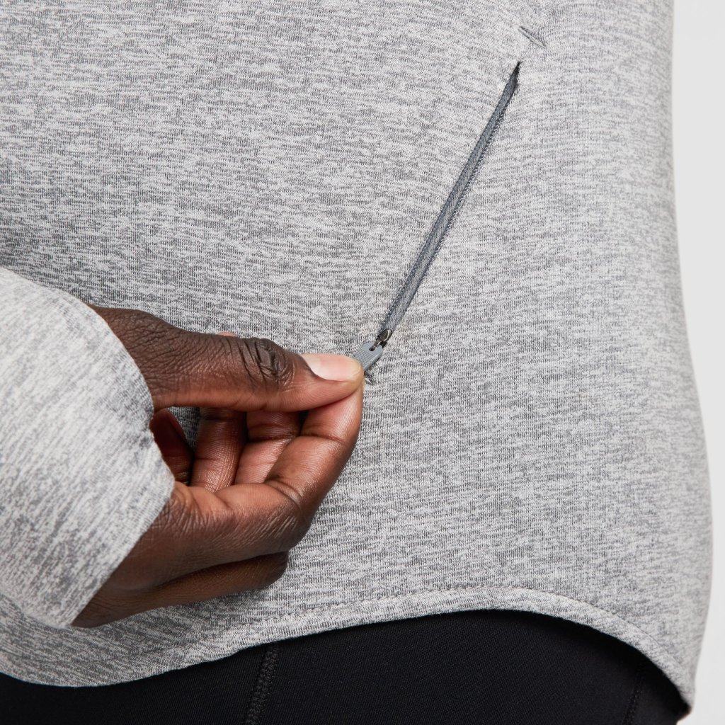 The top is tapered around the waist so that layering with other pieces is easier. A curved hem helps keep you covered through your stride. Plus, thumbholes let you extend your coverage and help hold the sleeves in place.
