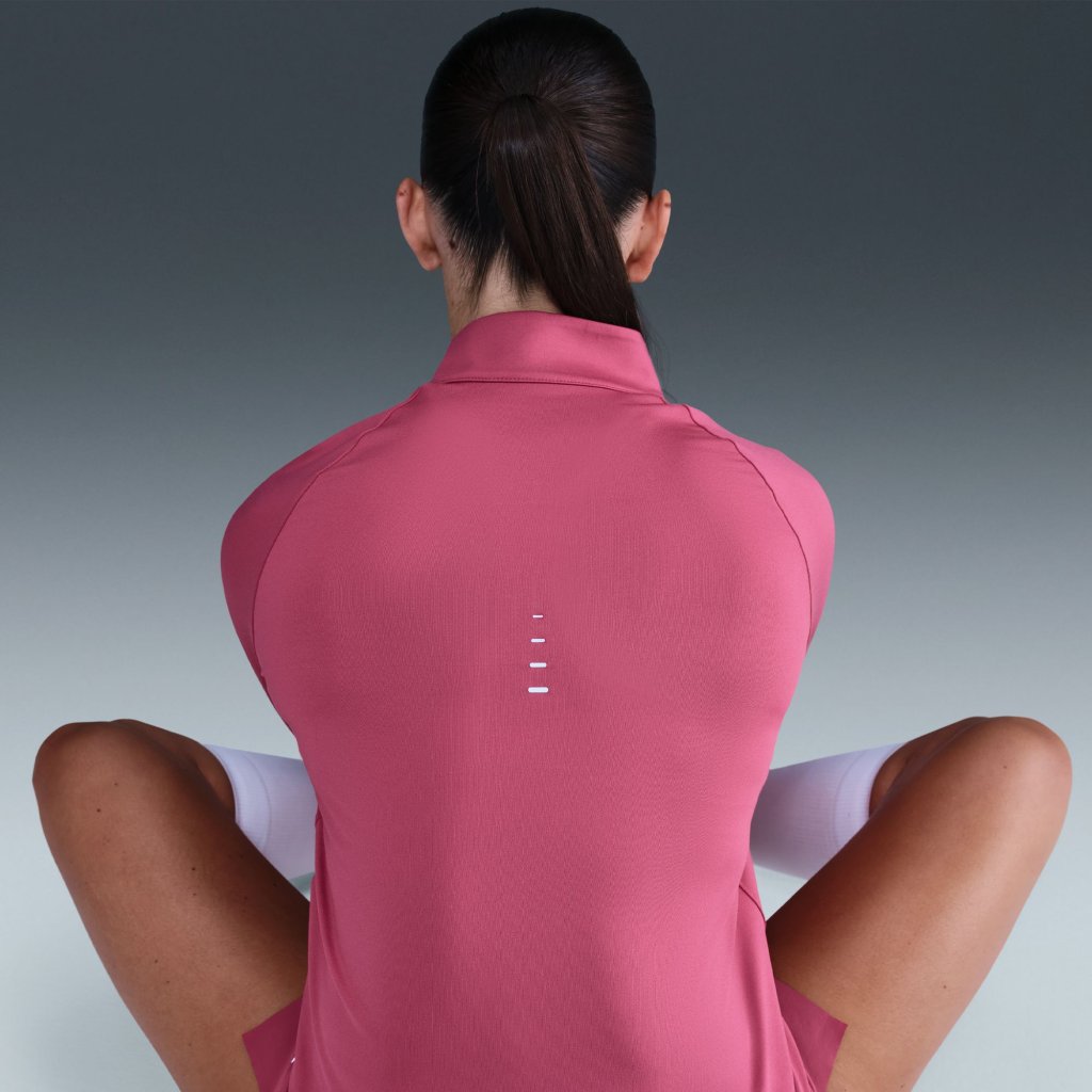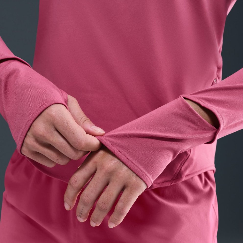 Using insights from runners like you, we prioritised functionality to refresh our Swift essentials. This lightweight mid layer has been designed to help reduce chafing. It's soft, sweat-wicking and helps block out UV rays so you can focus on your miles and nothing else. Unhindered movement The modified raglan sleeves are designed to help reduce underarm chafing and allow for a wider range of motion. Stay dry Nike Dri-FIT technology moves sweat away from your skin for quicker evaporation, helping you stay dry and comfortable. Functional Fit The top is tapered around the waist so that layering with other pieces is easier. A curved hem helps keep you covered through your stride. Plus, thumbholes let you extend your coverage and help hold the sleeves in place. Time and space The watch windows on either sleeve make it easy to check the time. A zip pocket on the left side seam fits items like earbuds, a key or a card. Product details: