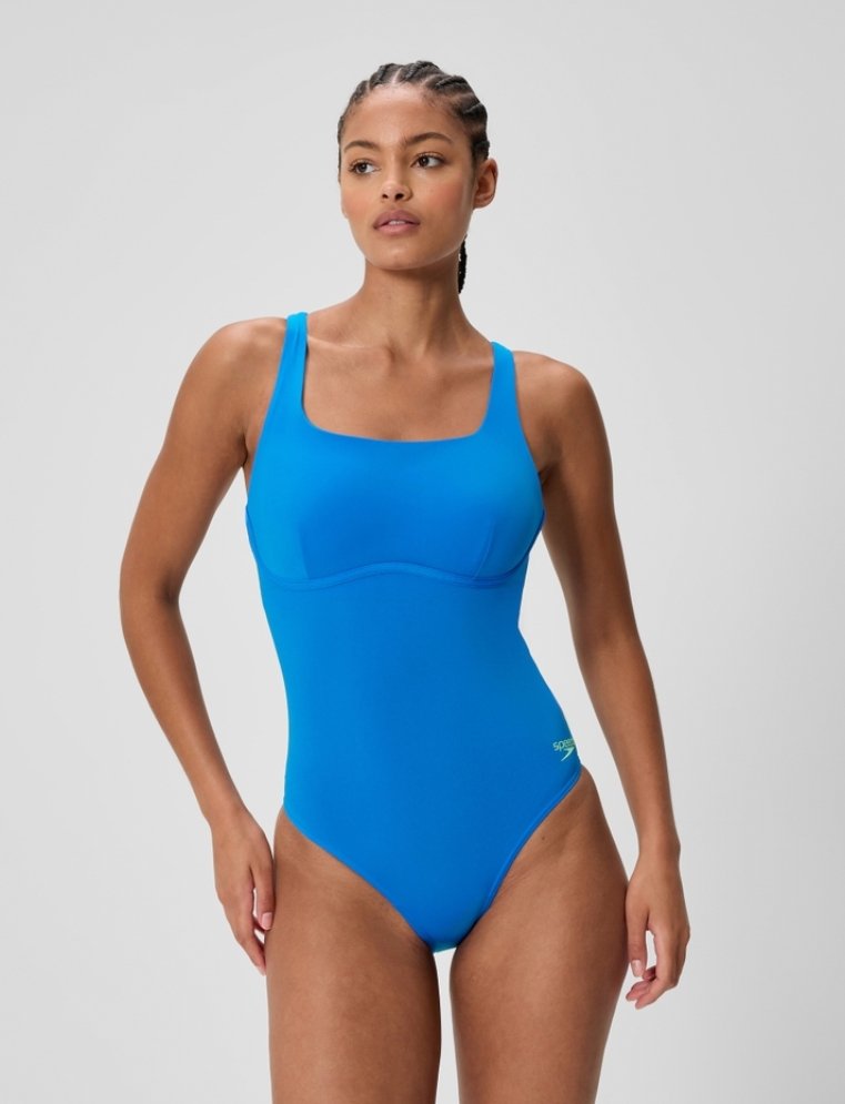 Go all-in wearing our Flex Band Swimsuit, designed with an integrated Swim Bra so you can glide through workouts without letting loose. The compressive fabric locks you in during high-intensity training, so you can wave goodbye to bounce. Underbust mesh inserts combine with internal and external seamlines to maximise support. A comfy, wide J-Fit elastic underband stretches to adjust to any changes in your shape. Made from Endurance+ Max fabric, which resists chlorine, sunscreen, oil and pilling, so you can swim-wash-repeat. Body made of 53% Polyester, 47% PBT. Endurance+ max fabric: Body made of 53% polyester, 47% pbt, with high chlorine resistance for long-lasting performance – resists sunscreen, oil and pilling Bust support designed to offer a combination of internal and external seamlines to encapsulate the breasts whilst the fabric offers compression required to keep the bust in place Underbust power mesh inserts made from 70% polyester, 30% Spandex offer additional support and allow ventilation and water flow J fit elastic underband offers more comfort with a wide underband that stretches to adjusts to your body Flattering square neckline paired with an evolution of the Racerback to support full range of upper limb movement Medium leg Gusset liner made from 100% polyester