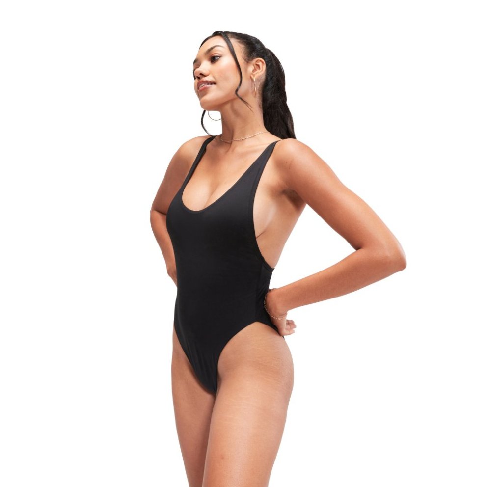 The Speedo Solid Convertible One Piece swimsuit for women is a sleek black one-piece swimming costume that radiates summer vibes. Designed with three-way straps, this swimming costume offers effortless versatility and style. The flattering round neck, high leg and bold coverage ensure a perfect look. In addition, it is made from quick-drying fabric that is soft to the touch and made from recycled yarns. Get ready to enjoy the beach or pool in style and comfort! Features: