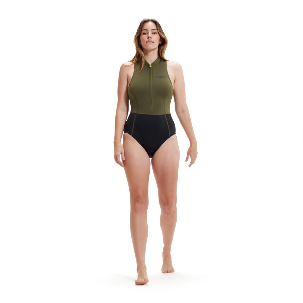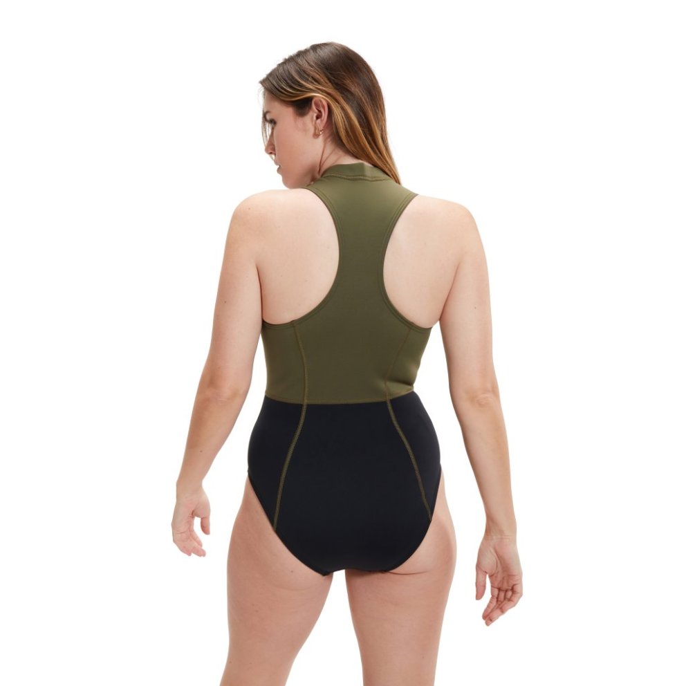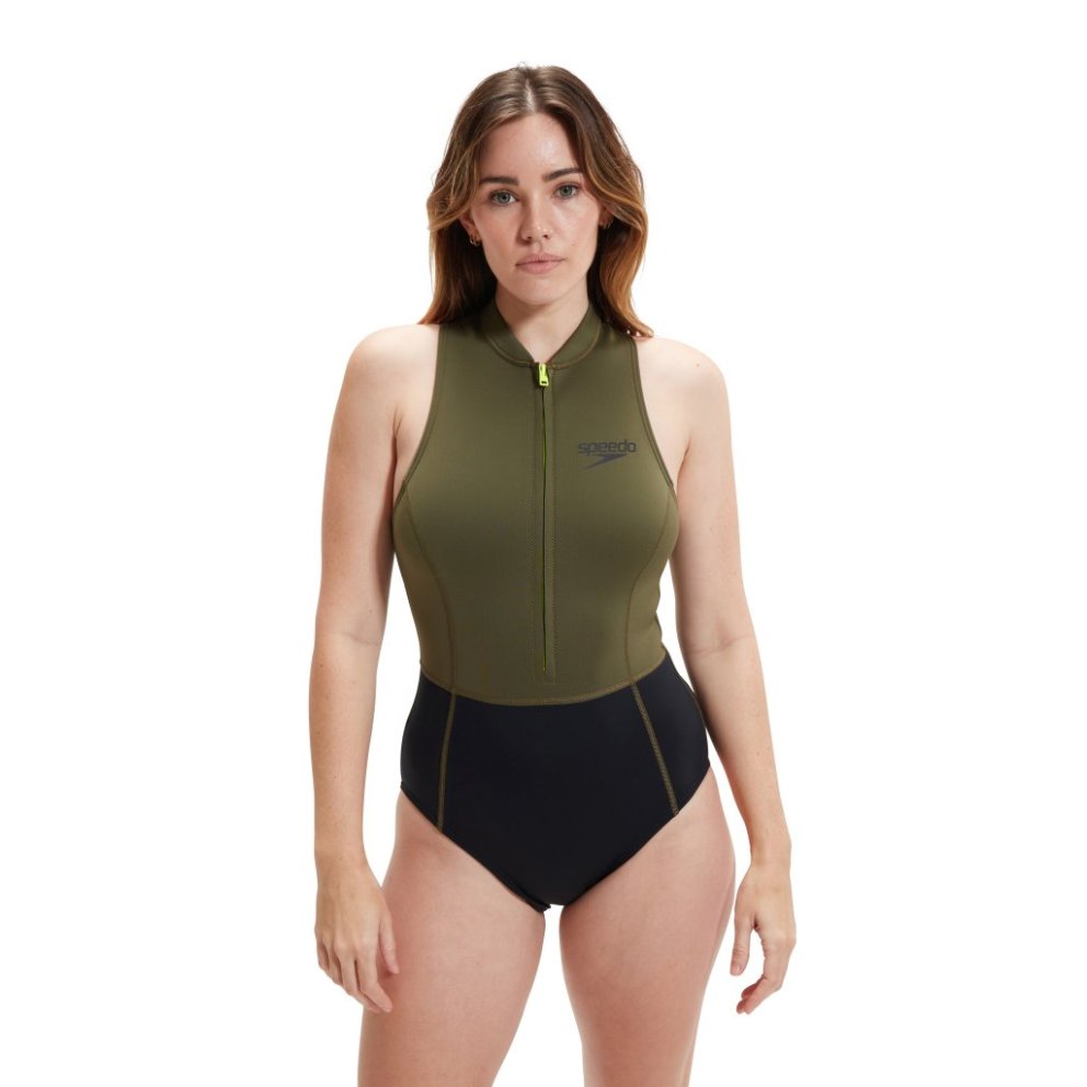 The Speedo Womens Open Water Sleeveless Thermal Swimsuit Black/Yellow has been designed for swimming outdoors. It features a sleeveless design for maximum freedom of movement, a simple zip up top making it easy to change and a medium leg for ample cover while you swim. The swimsuit comes in a black and safety yellow colourway and is made with 100% chloroprene rubber with thermal properties, to keep you warmer.