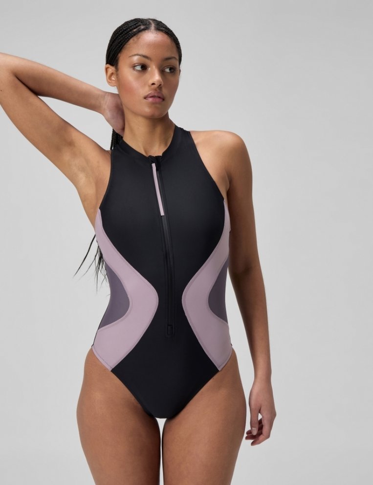 On the board, in the ocean, wherever your adventure takes you. Our versatile new Front Zip swimsuit flexes to your environment so you can explore new horizons. A waterproof front zipper with a bonded zip pull makes changing easy. Flattering tonal panels, a high neckline and a contemporary leg design deliver a streamlined aesthetic. Rest easy, knowing the durable fabric resists chlorine and pilling. Designed with a full mesh lining to promote water flow. Our new Biofuse swimwear range is made from Ocean Flex fabric. Body made of 80% Nylon, 20% Elastane (Creora Regen). Ocean flex fabric: Body made of 80% nylon, 20% elastane (CREORA regen) Removable cups Contemporary leg Classic coverage bottom Full mesh lining made from 92% polyester, 8% elastane (CREORA regen) for added waterflow Front waterproof zipper with bonded zipper pull Utilitarian back zip pocket Chlorine & Pilling Resistant