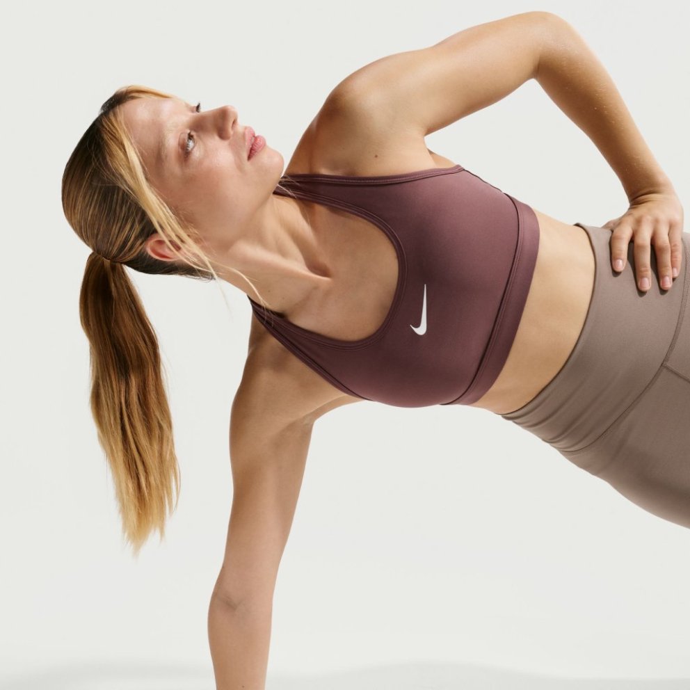 Þú ert á hreyfingu – púðarnir ættu ekki að vera það. Þessi Swoosh-íþróttatoppur er með innsaumuðum púðum sem haldast á sínum stað, svo þú getir lagt hart að þér án þess að hafa áhyggjur af því að þeir færist til eða krumpist. Meðalstuðningur veitir þétt og öruggt hald sem hentar vel fyrir æfingar og dans, og heldur öllu þar sem það á að vera. Svitadrífandi, aðlögunarhæft efni nær fljótt aftur lögun sinni og tryggir þægindi allan æfingatímann. Létt efnið liggur að líkamanum eins og önnur húð þegar álagið eykst, en jafnar sig fljótt í hvíld og veitir mjúka mótun og stöðugt hald. Mjög teygjanlegar trefjar gera auðvelt að fara í og úr toppnum. Nike Dri-FIT tækni flytur svita frá húðinni svo hann gufi hraðar upp og hjálpar þér að halda þurru og þægilegu, á meðan netfóður stuðlar að betra loftflæði. Swoosh-línan býður mismunandi stuðning eftir þörfum – allt frá léttum stuðningi til meiri þekju og stillanleika.