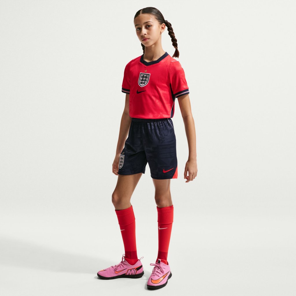 Nike presents: England's 2026 Away shirt. One England. One family. This Three Lions kit features a knit pattern celebrating the diverse cultures and people that make up their country. Stay Dry Nike Dri-FIT technology moves sweat away from your skin for quicker evaporation, helping you stay dry and comfortable. Modelled after the pros Our Stadium Collection pairs replica design details with sweat-wicking technology to give you a game-